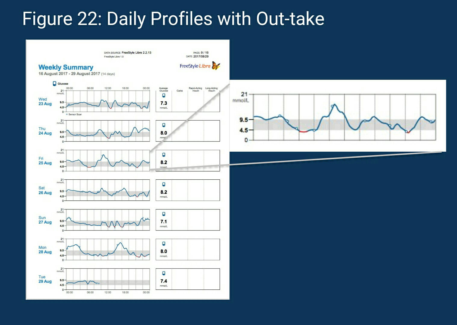 7-On the 21st of August, there is a two-hour gap in the profile. This indicates that the patient failed to scan within 8 hours. In fact, the next scan occurred on the following day in the early morning hours. Looking at the five daily profiles it is also apparent that one day does not predict the next. This suggests that changes in the treatment regimen have to consider variability in medication administration, meal timing and content as well as sleep/wake patterns. What explains this variability and instability? The first week’s daily profiles provide some evidence that patient behavior is a key factor. It appears that responses to instability are delayed and over-compensatory.